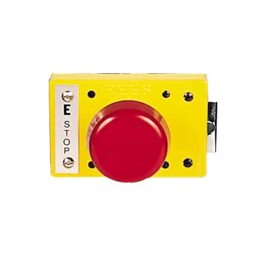 This heavy-duty, single plunger red emergency-stop palm button provides 1 NO and 1 NC contact arrangement. This 2 1/4″ button has a mushroom-shaped plunger with a spring latch that keeps the button latched down when pushed to meet NFPA 79. A release is incorporated. It also has provisions for attaching a padlock to the latch. The palm button cover plate has a solid neoprene gasket which provides an oil-tight seal upon installation. The force required to operate this button is 12.5 lb.