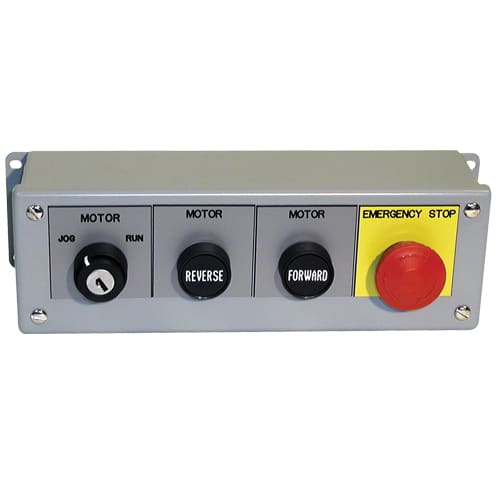 This 3 1/2″ x 10 1/2″ x 3″ station has a motor jog/run selector switch, forward and reverse push buttons, and a self-latching emergency-stop palm button in a NEMA 12 metal enclosure.